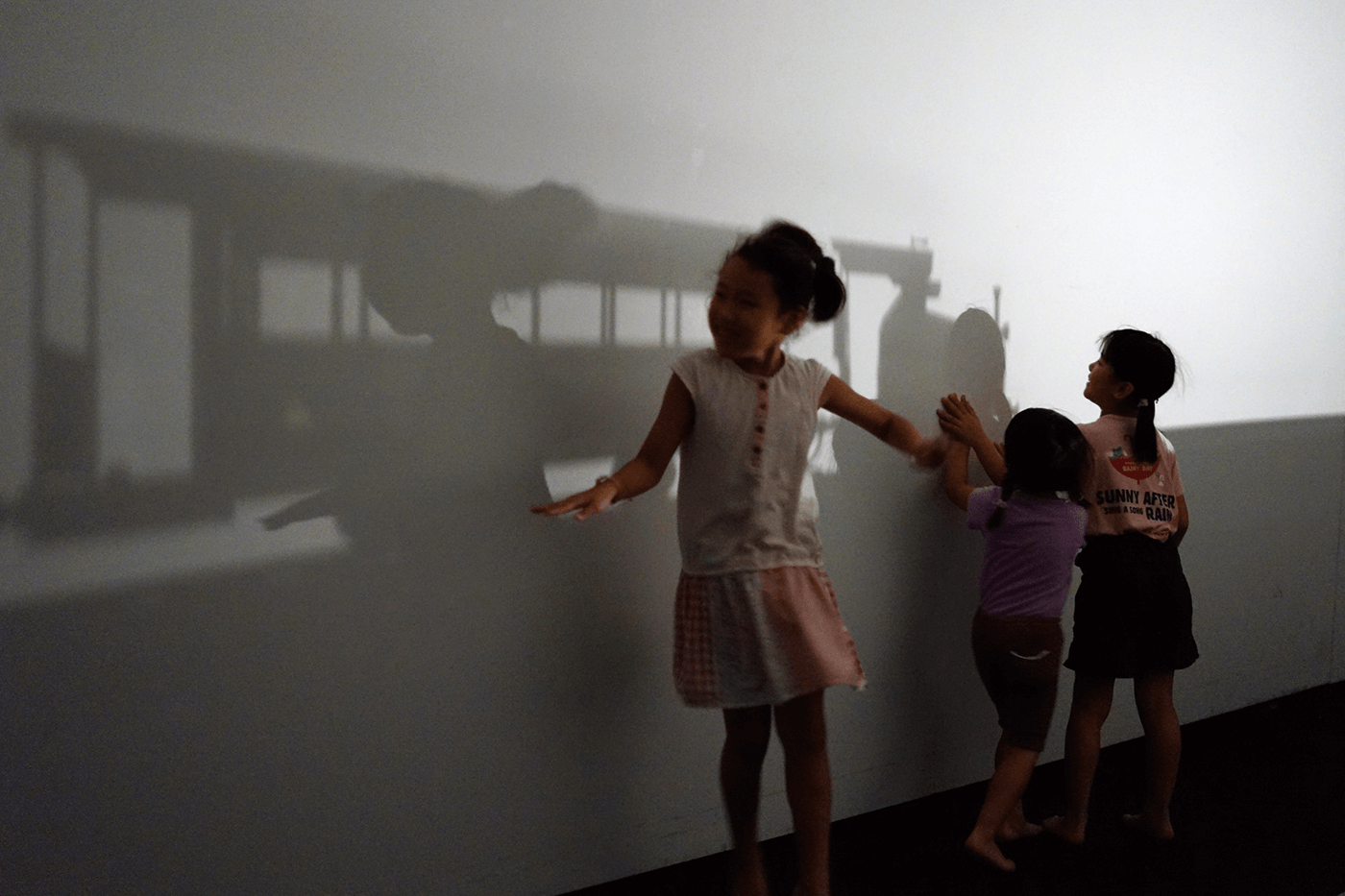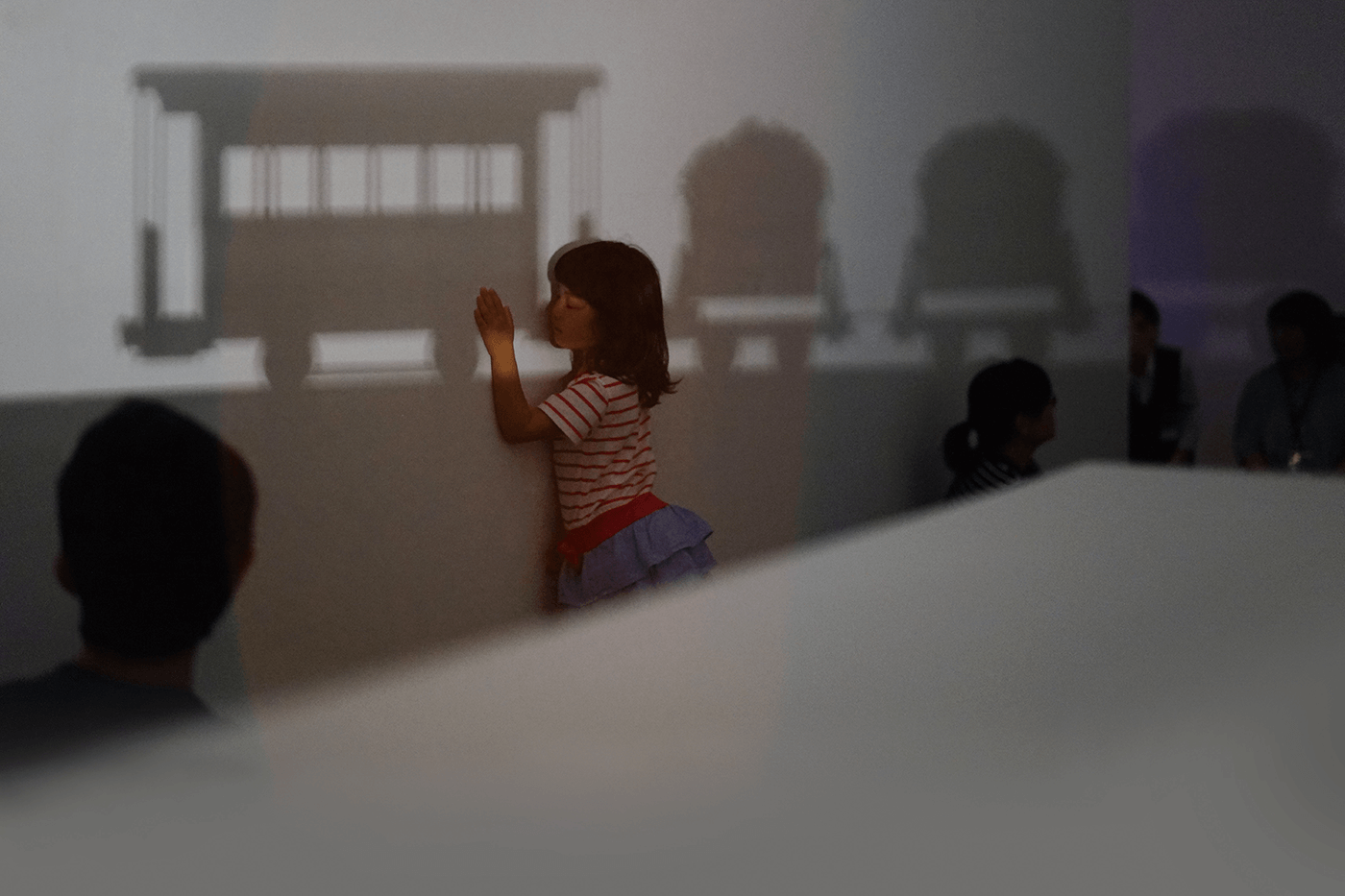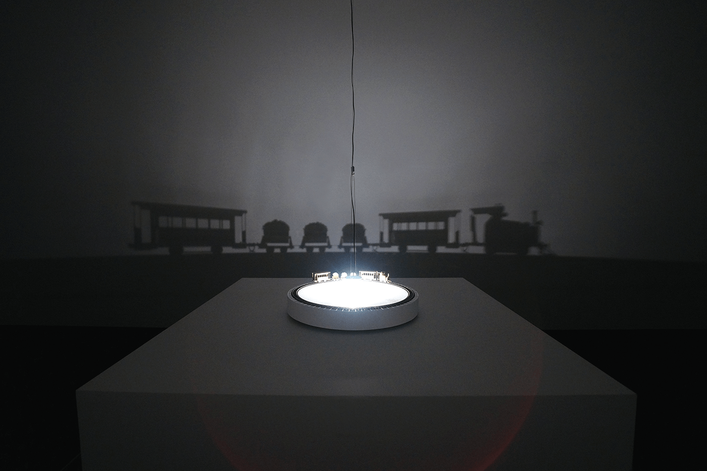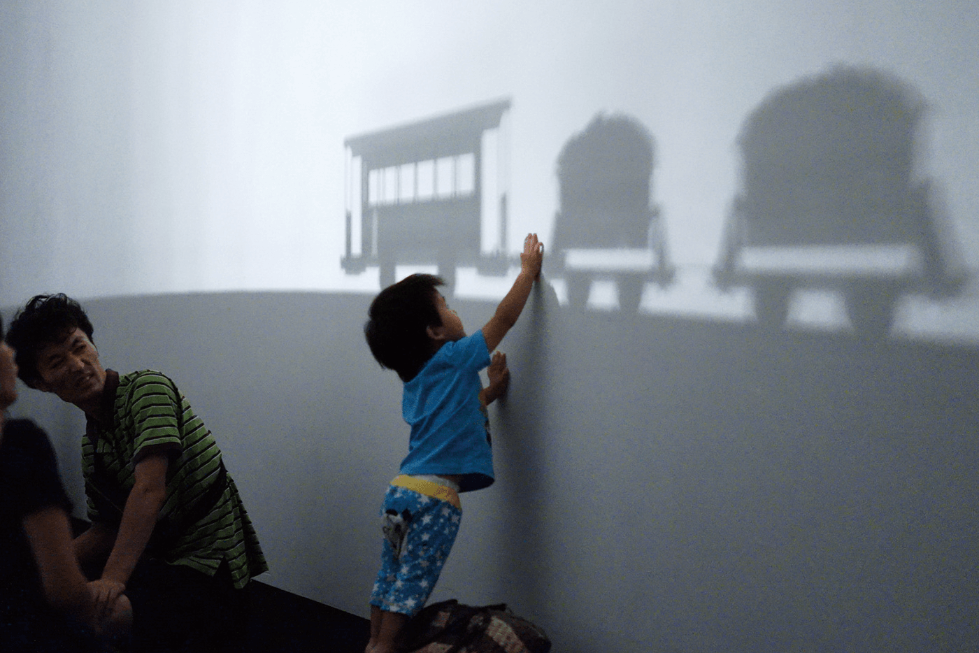 会場入口のトンネルを潜ると、まず最初に出会うのが 《Shadow train》だ。展示室の四方の壁を、汽車のシルエットが大きくなったり小さくなったりしながら、ゆっくり走っている。