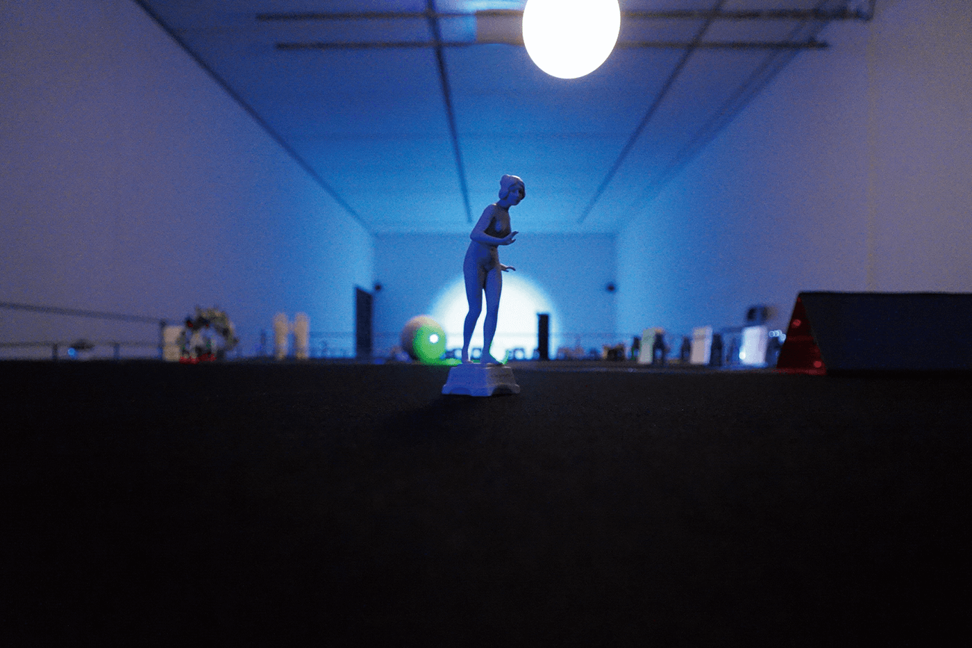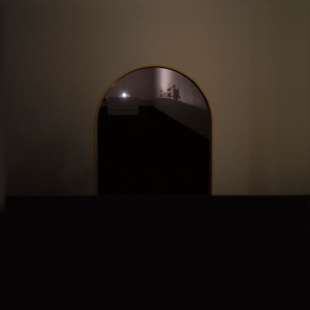 黒いカーペットが敷かれた床には鉄道模型の線路がひろがり、様々なオブジェがその周りに配置されている。振り子時計、豆本、地球儀、キノコ、ゴリラ、クジラ、パラパラマンガの装置、万華鏡のトンネル、プラズマ球、ゴジラ、薬莢、ブランコに乗った骸骨、花輪、アクリル球、緑に光る電球、ドリンキングバード、ダビデ像の顔、両の手…。ターンテーブルに置かれた灯光が、灯台のようにゆっくりと回転し、これらのオブジェの影を壁面に映し出している。