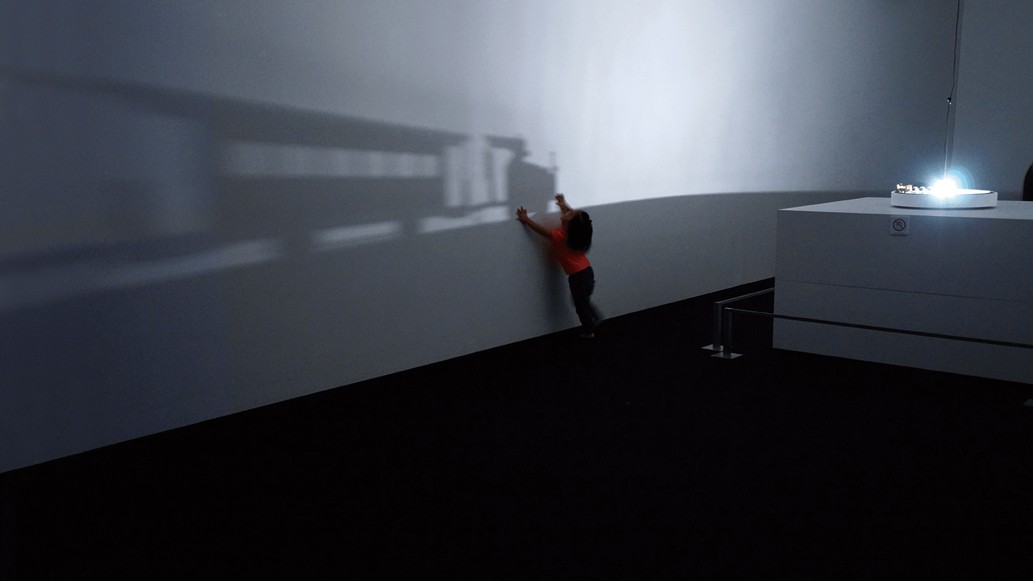 この映像のハイライトは、列車がアーチ型のトンネルを通過した瞬間に訪れる。画像が投影されている壁の下方に突然小さなトンネルが出現して、われわれがいる実世界に向かって列車が滑り出してくるのだ。その列車は、緩やかな弧を描きながら床を進み、再び壁に出現するトンネルのなかに消えていく。「こちら側」の空間に現れた不思議な列車は、巧みな映像プロジェクションによって生み出された虚像に他ならない。しかし、それが虚像であるとはいえ、目の前に突然列車が出現するという予想を超えた事態を、観客はすんなりと呑み込めずにいるだろう。