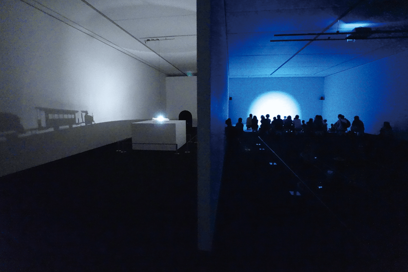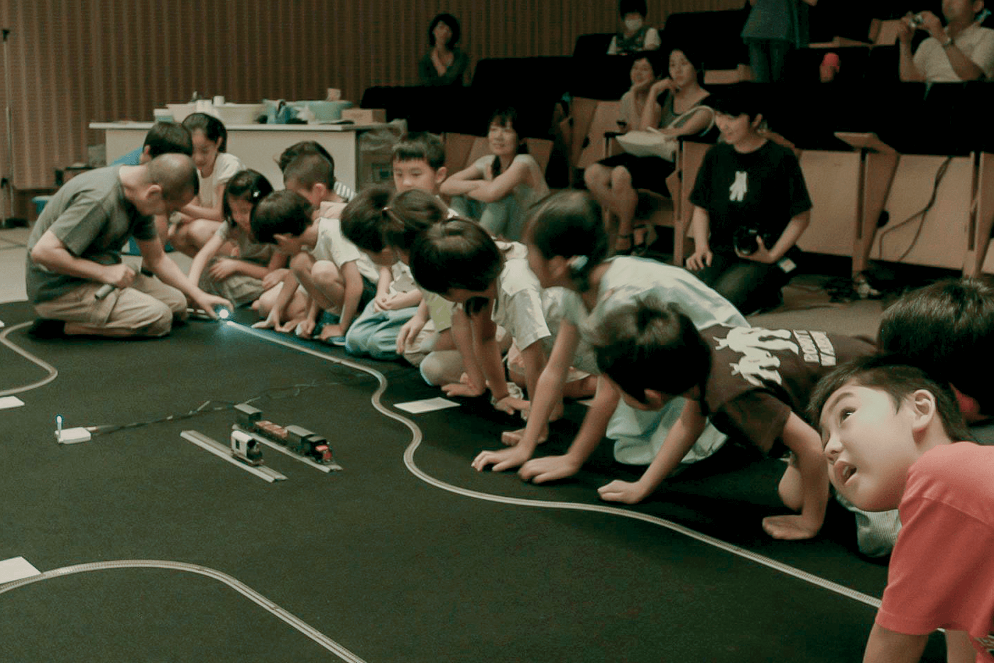 列車が床面に滑り出した瞬間、無音になる。現実世界に引き戻され、振り子時計の音を気にする子。列車を掴もうと映像に歩み寄る子。また映像の観賞後、インスタレーションをつぶさに確認して回る子どもたちの姿も、印象に残っている。