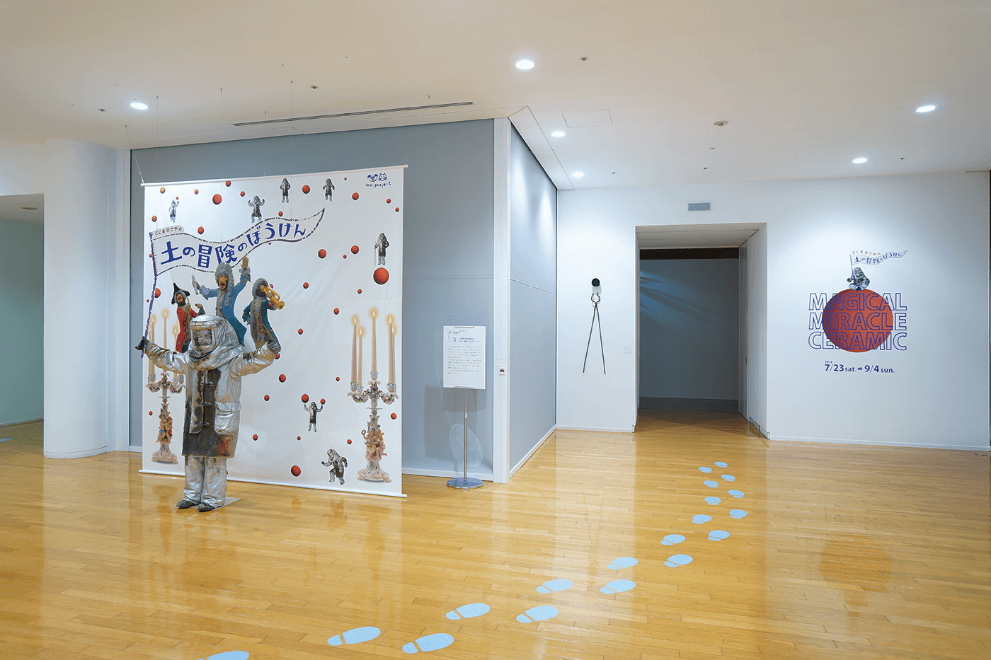 氏の耐火スーツは今展のチラシにも登場しており、やきものを巡る冒険の案内人の役割を果たす。また、チラシのビジュアルをフォトスポットに転用。展覧会場入口には鯉江良二が用いた火バサミと、氏の引出黒茶碗を展示した。