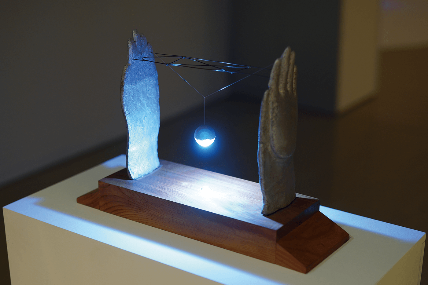 伊藤慶二の作品《AYATORI》の台座部分にフラッシュライトを仕込み、吊り下げられた球体の影を天井に映し出す。手は仏を思わせ、また、球体は我々の住む地球のイメージに転化され「救い」のイメージをもたらす。