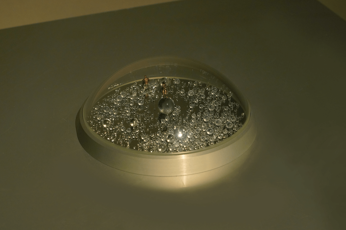 また展示ケース内には、光、球、水など、虚と実を感じさせる、小島久弥のオブジェ作品《World》写真左、《8.9266 L》写真右が展示された。