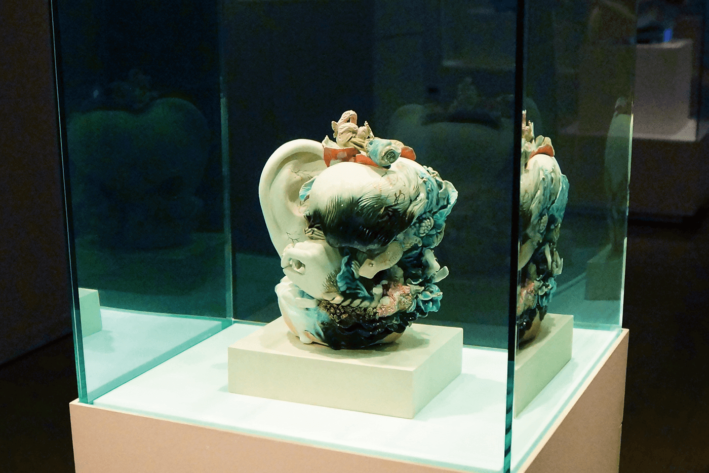 作品に近づくにつれ、鑑賞者はケースに入った他の作品とは何か違う様子に気づく。作品が水の中に入っているのだ。エアーポンプによりエアレーションされた水槽内の作品からは、小さな泡が絶え間なく立ち昇る。時折、口を表現した箇所から大きな泡が吐き出される。