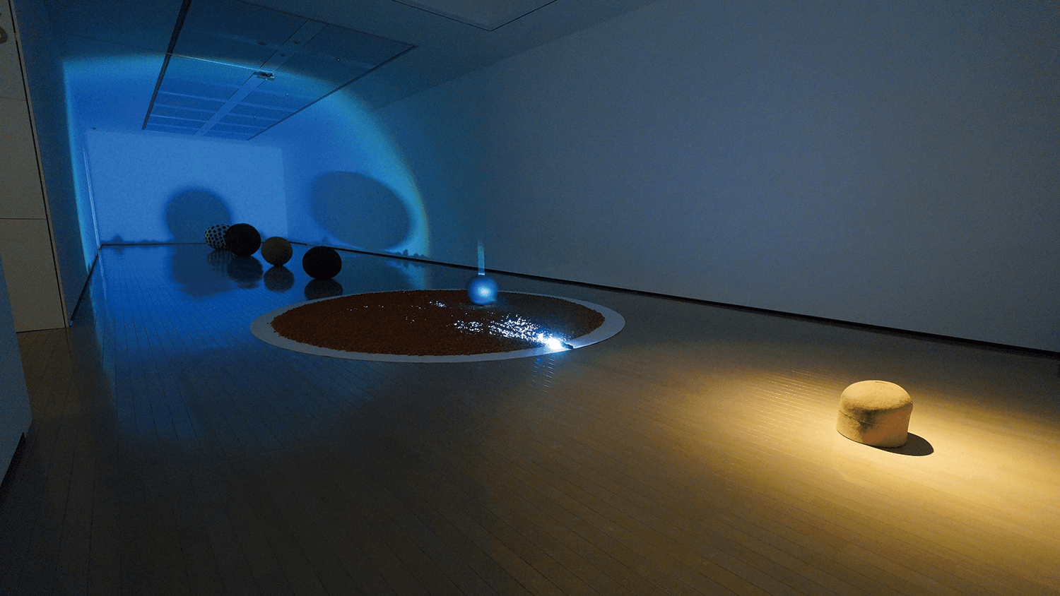 惑星を配置するようにインスタレーションされた、ボリュームある球体作品。それらの影は、フラッシュライト間近に置かれた、地球を彷彿とさせる極小さな青い球体の影に覆われてみえない。これらすべてを伊藤慶二の《頭》が巨視的に捉えている。