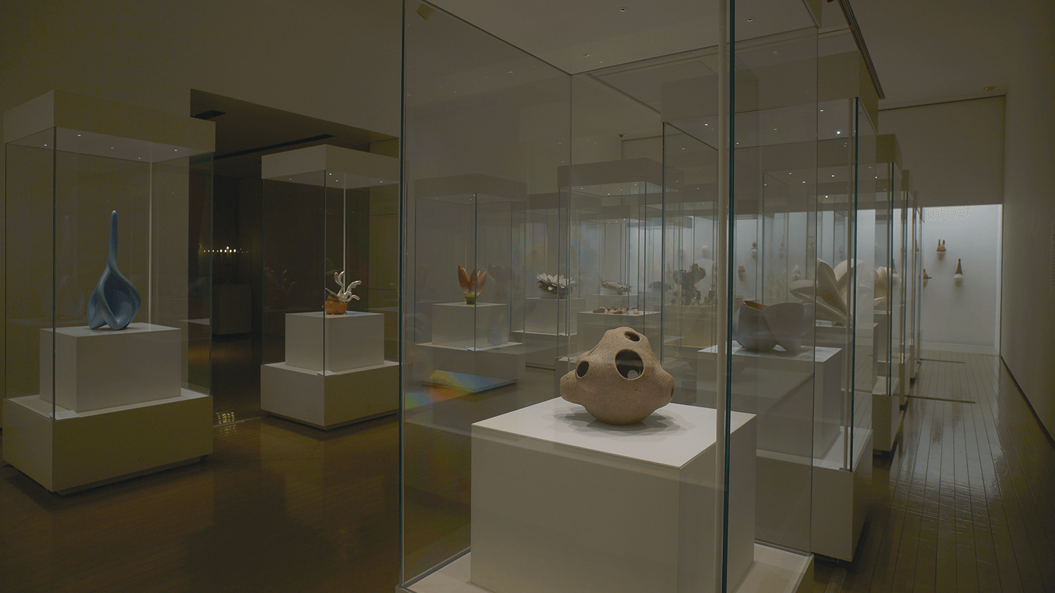 色については、⑤「地平線を辿って」で、釉薬に注目しています。いくつかのやきものについて、釉薬の境い目を横一線にそろえて展示してあります。見る人は釉薬そのものをよく見ることにもなります。釉薬に関してはさらに③「釉の囁き」で、釉薬がひび割れる時の音を、作品のそばで聞くことができます。