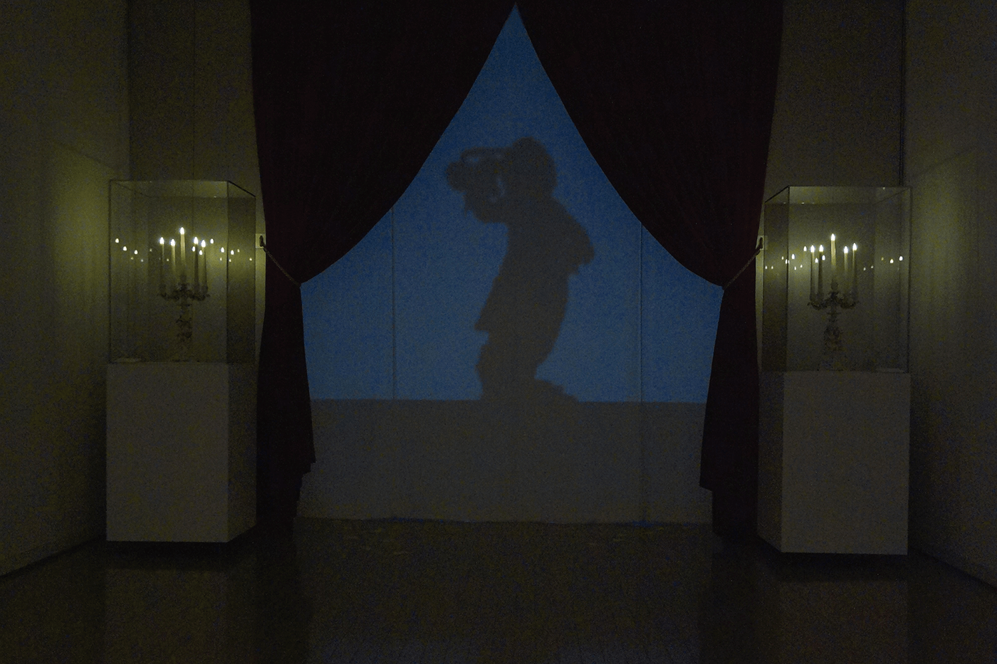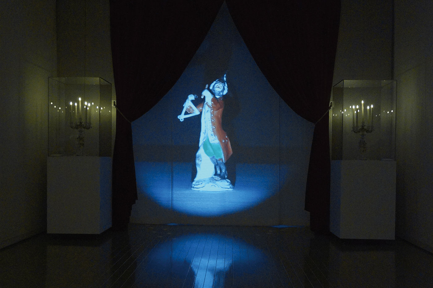 この展示の実験中、面白い発見がありました。部屋の入口と出口を白い布で覆うことになり、その布を何種類かの中から選んでいたのですが、布に人形の影や映像を映してみたところ、裏側にまで透けて見えたのです。そこから、入口をベルベット調のカーテンで飾り、まるで劇場の舞台のようなところに《猿の楽団》の影や映像が映るという演出がうまれました。