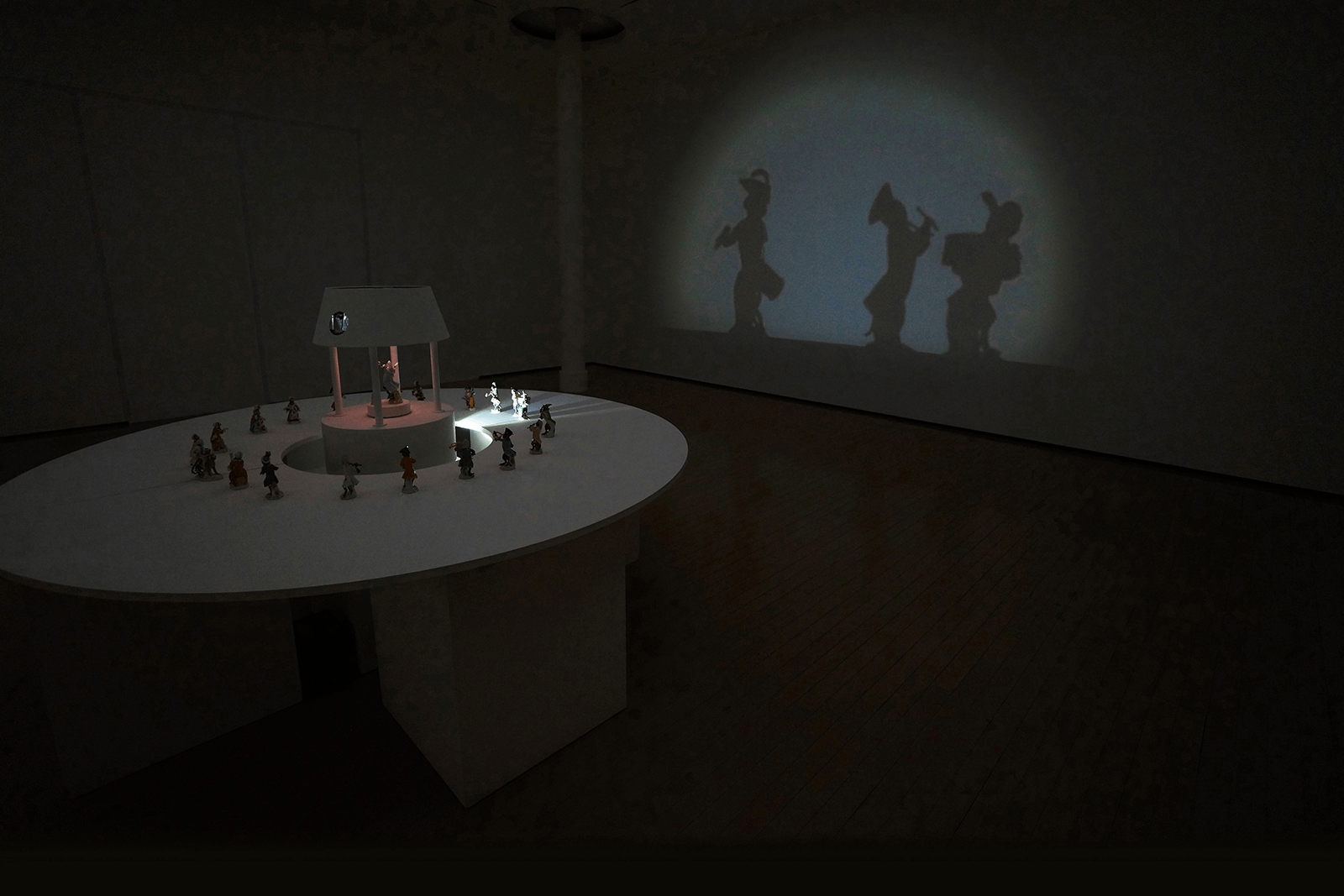 今回はマイセンの貴重な作品をガラスケースの中ではなく、円卓に露出展示することになりました。人形の影や映像がちょうどよい大きさで壁に映るには、回転台からどれくらいの距離で人形を置けば良いか。人形にさわろうと手を伸ばしても届かない距離はどれくらいか。そうしたいくつもの条件から、円卓のサイズと人形の位置を決めました。