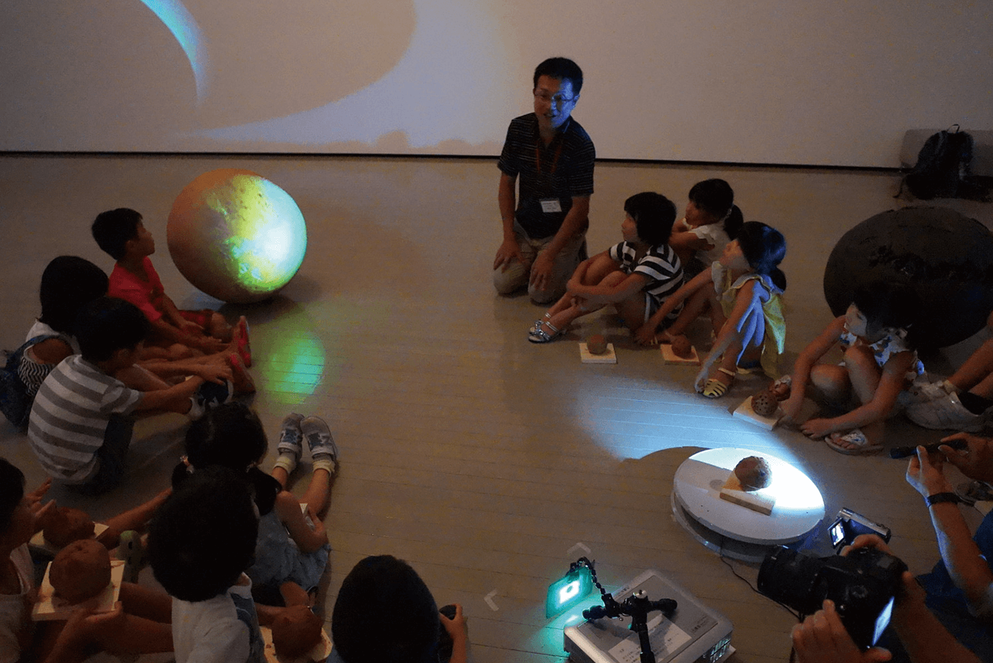 膨大な収蔵品をチェックし、展覧会場の空間を確かめられたお2人から、次々と展示のアイデアが出されます。「徳丸鏡子さんの巨大な作品《蠕動:表皮から記憶へ》の周りに鉄道模型を設置して、列車にカメラを搭載して撮影してみよう」「展示室の天井から透明な板を吊り下げ、そこに作品を並べて下から見上げる展示はどうだろう」…思いもよらないアイデアの数々。こんな展示が実現したら、きっと楽しいだろうな。会場を巡る子どもたちの笑顔が目に浮かびます。