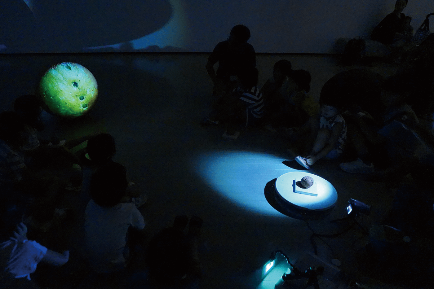 さらに、日常私たちの周りにある自然などの環境から、壮大な宇宙へのまなざしがあります。②「ゆうひので」では、ライトが作品に出入りし、作品の影が形を変えますが、それを日の出・日の入りに見立てています。⑥「重力」では、球形の作品が吊り下げられ、揺れ動きますが、地球や天体の動きに思いを馳せることを誘っています。